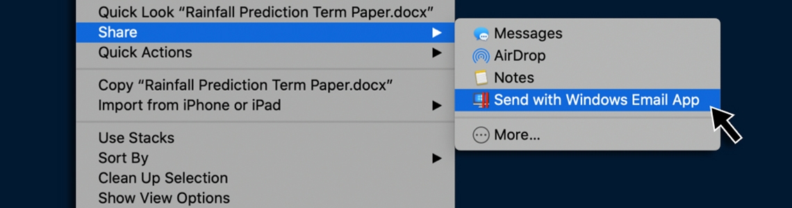 A few months ago, I wrote about using the Share menu to add PDFs to Books or other PDF reader applications. Parallels Desktop® 15 for Mac adds another use of the Share menu: sending files on your Mac from your Windows email account.