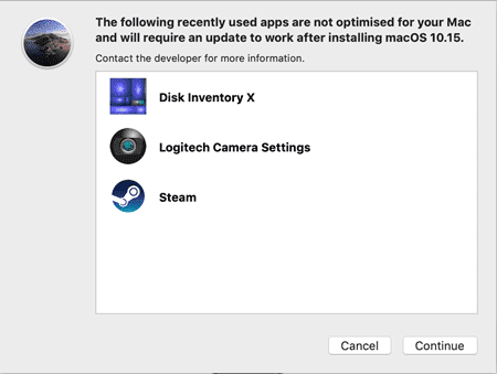 随着macOS Catalina放弃对32位的支持,很多用户可能会发现自己电脑上运行不了自己常用的应用程序。现在,macOS会在升级到macOS Catalina之前警告用户,并告诉您升级之后哪些应用程序会不兼容: