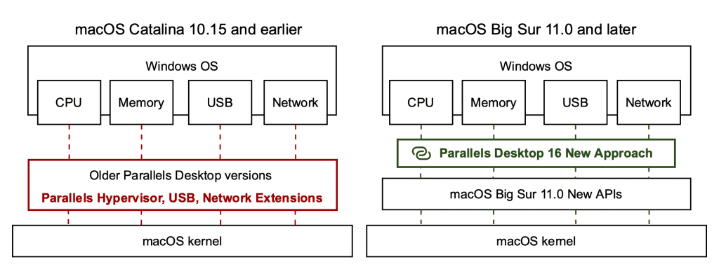 下面的结构图直观地描述了相应 macOS 版本上的默认 Parallels Desktop 模式之间的差异。左侧显示了使用 Parallels 系统扩展的旧 Parallels Desktop 设计,右侧显示了使用 macOS Big Sur API 的新研发的 Parallels Desktop 16。