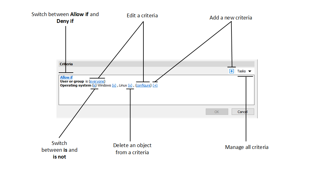 - Objects are connected by the OR operator. For example, if you only create a criteria for matching client device operating systems, the rule will be applied if one of the operating systems matches the client connection.