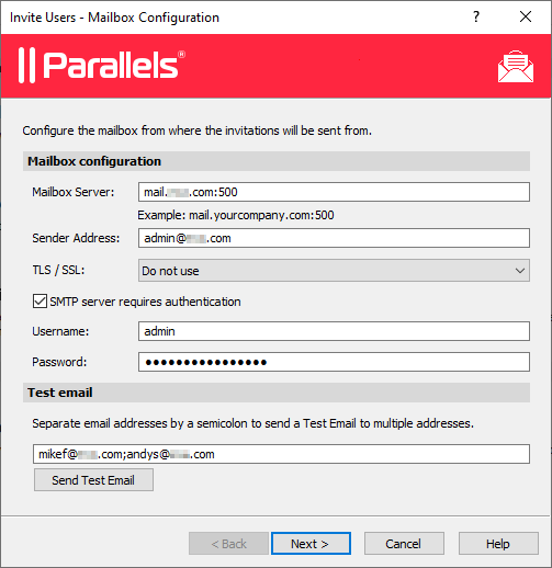 - The Invite Users wizard opens. On the first page, specify the mailbox information that should be used to send invitation emails to users.