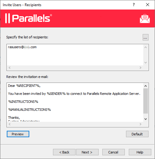 %RECIPIENT%— Specifies the name of a recipient to whom the email message is addressed.%SENDER%— The sender's email address that you specified in the first step of this wizard when you configured the outgoing email server settings.%INSTRUCTIONS%— Includes a custom URL hyperlink for automatic configuration of Parallels Client. The URL uses the Parallels Client URL scheme. For more info, see RAS Web Client API and Parallels Client URL Scheme.%MANUALINSTRUCTIONS%— Includes instructions for manual configuration of Parallels Client.