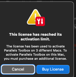 This license has reached its activation limit. The license has been used to activate Parallels Toolbox on 3 different Macs. To activate Parallels Toolbox on this Mac, you must purchase an additional license.