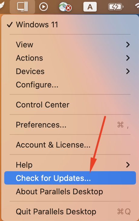 To check for updates, click on the Parallels Desktop icon > select Check for Updates...: