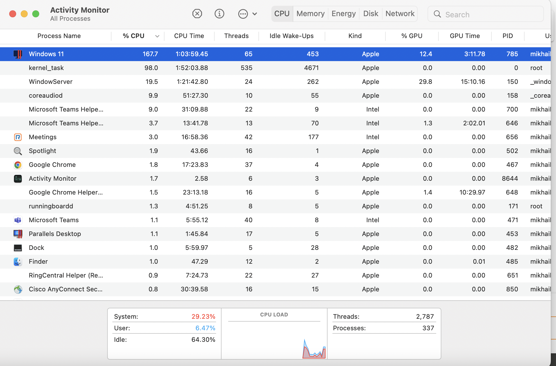 In Activity Monitor on your Mac you can see the Windows (prl_vm_app) process, responsible for running a virtual machine that consumes over 100% of your CPU.
