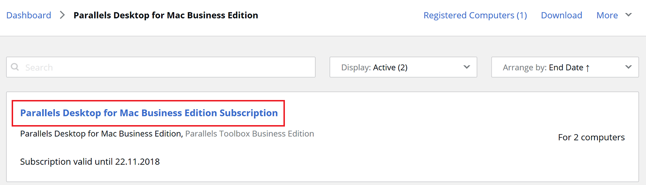 Open your Parallels account Dashboard and click on Active subscriptions under the product in question.