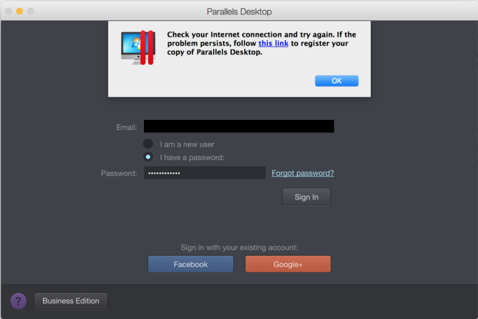 After installing the latest upgrade I'm prompted to login with my Parallels account. When I try doing so an error message shows up: "Check your Internet connection and try again. If the problem persists, follow this link to register your copy of Parallels Desktop.". The Internet connection is fine.