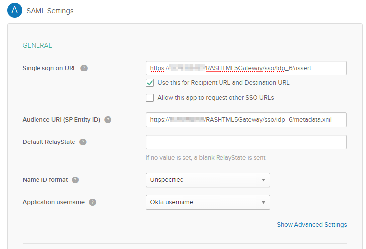 - Audience URI (SP entity ID) - paste SP Entity ID taken from RAS Server, e.g. https://IPADDRESS/RASHTML5Gateway/sso/idp_6/metadata.xml