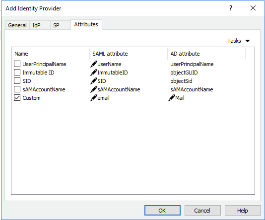 3. Switch to Attributes tab and select the appropriate attribute for you. In our example this will be Custom, SAML = email, AD = Mail