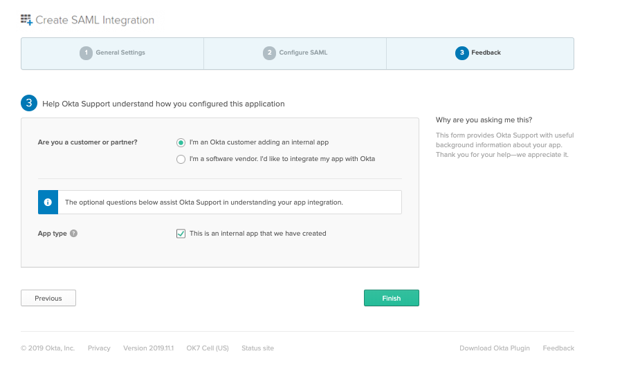 3. On the next page enter any information to satisfy the requirements to not leave the fields blank, (we will import Okta settings using metadata file later) and click Finish.