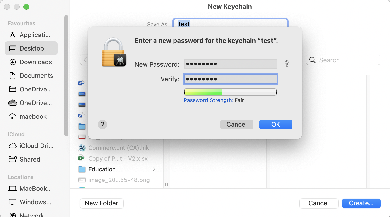 2. On the top Mac menu bar click File > New Keychain... > create a name for the new Keychain and select the folder where it will be stored, e.g. Desktop. Click Create.