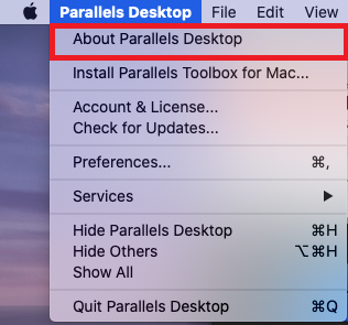 icon (on the right side of Mac menu bar), then choosing About Parallels Desktop from the drop-down list.