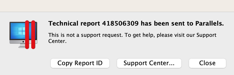 Note: Sending a technical data report to Parallels is not considered a request to Parallels Support and does not create a ticket for a Parallels Support team automatically. If you need to open a support request, please visit this page.