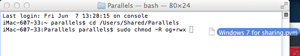 Instead of /path_to_virtual machine_bundle, insert the real path to the .pvm bundle you want to share. The easiest way to do this is to drag and drop the virtual machine's bundle icon next to the sudo chmod -R og+rwx like this: