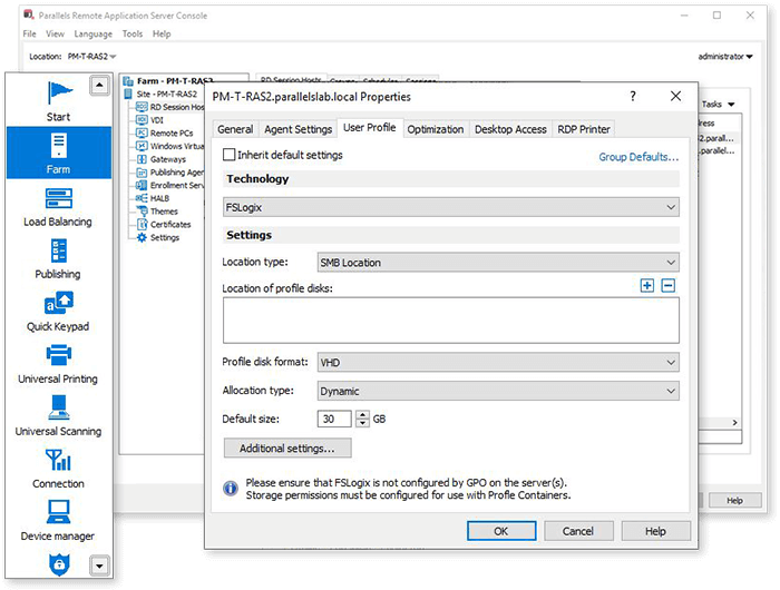 Easily manage and configure FSlogix Profile Containers from the Parallels RAS Console, required in multi-user virtual environments.